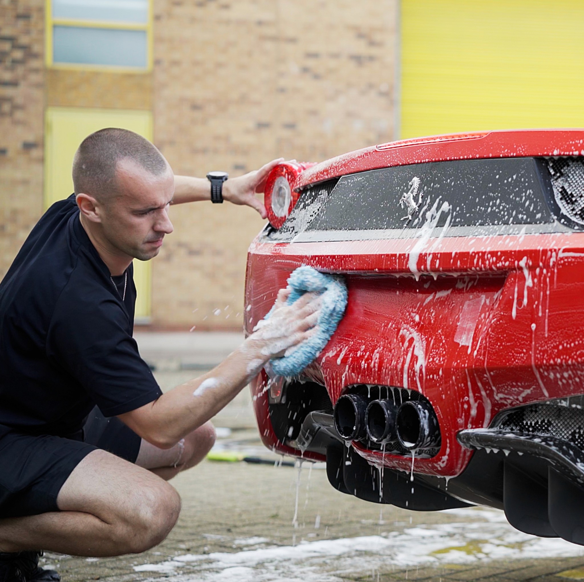 The Contact Wash: Following a deep snow foam pre-wash to lift loose grit, I perform an ultra-safe contact wash using premium tools and pH-neutral products to ensure a scratch-free clean.